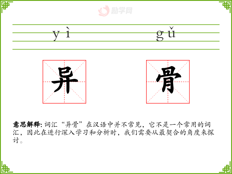 “异骨”由“异”和“骨”两个字组成。“异”字有不同、异常的意思,“骨”字指骨骼。在古代文献中,可能会有关于骨骼异常的描述,但“异骨”作为一个词汇并不常见。