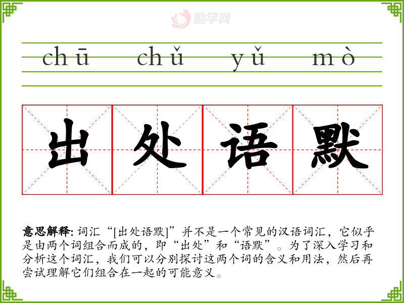 综上所述,虽然“[出处语默]”这个词汇并不常见,但通过对“出处”和“语默”两个词的分析,我们可以理解它们在不同语境下的意义和用法,以及它们在语言学习和表达中的重要性。