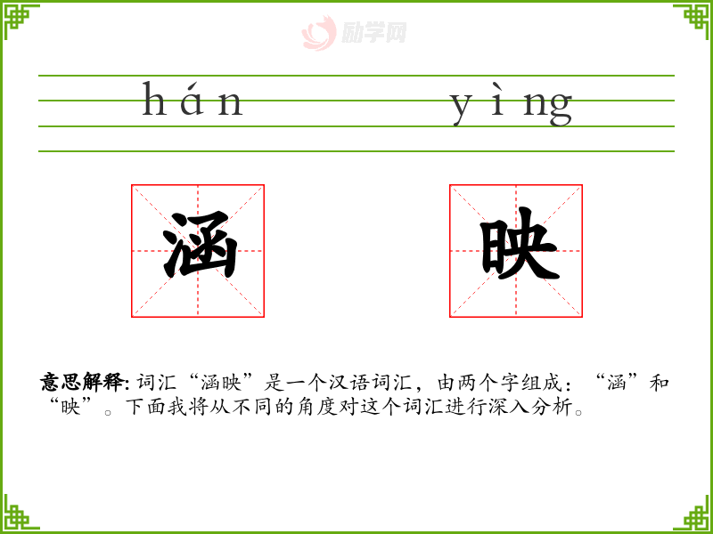 词汇“涵映”是一个汉语词汇,由两个字组成:“涵”和“映”。下面我将从不同的角度对这个词汇进行深入分析。