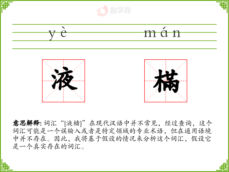 词汇“[液槠]”在现代汉语中并不常见,经过查询,这个词汇可能是一个误输入或者是特定领域的专业术语,但在通用语境中并不存在。因此,我将基于假设的情况来分析这个词汇,假设它是一个真实存在的词汇。