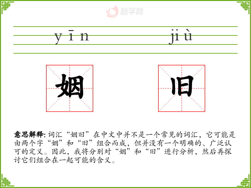 词汇“姻旧”在中文中并不是一个常见的词汇,它可能是由两个字“姻”和“旧”组合而成,但并没有一个明确的、广泛认可的定义。因此,我将分别对“姻”和“旧”进行分析,然后再探讨它们组合在一起可能的含义。