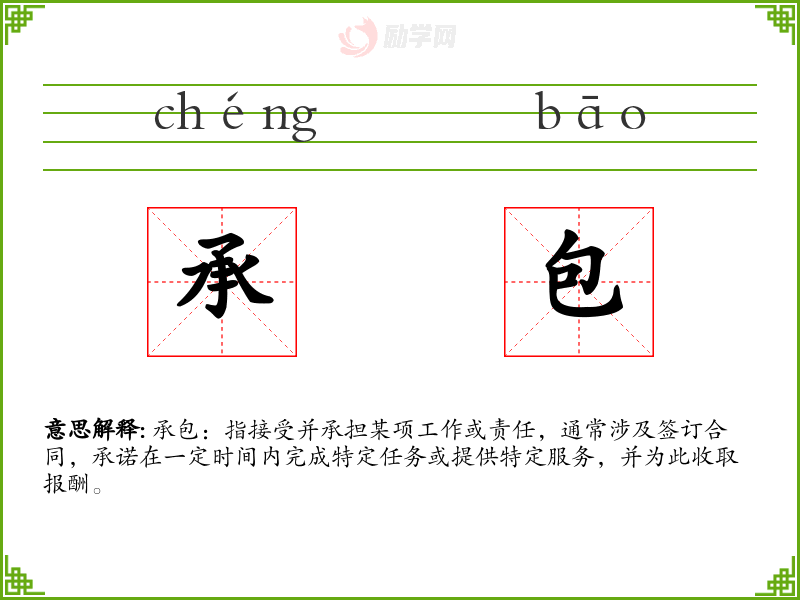 - 专业领域:在商业和工程领域,“承包”是一个专业术语,涉及合同签订、项目管理等,如“该公司成功承包了地铁建设项目。”