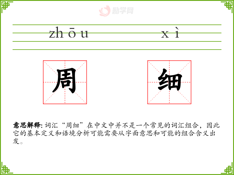 词汇“周细”在中文中并不是一个常见的词汇组合,因此它的基本定义和语境分析可能需要从字面意思和可能的组合含义出发。