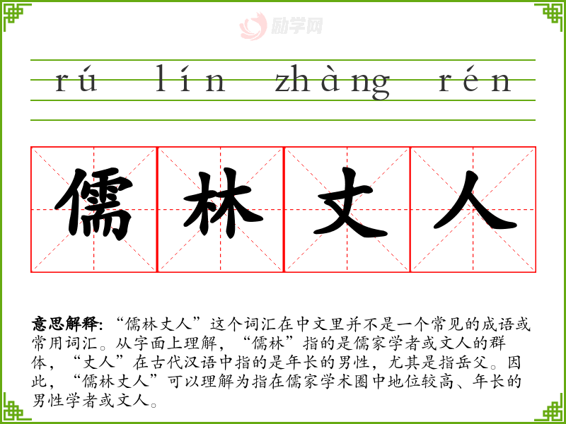 由于“儒林丈人”不是一个常用词汇,它在现代文学、口语或专业领域中很少出现。在古代文学中,可能会在一些描述儒家学者或文人圈子的作品中出现,用以指代那些在学术上有成就、德高望重的**。