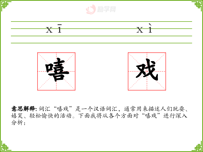 词汇“嘻戏”是一个汉语词汇,通常用来描述人们玩耍、嬉笑、轻松愉快的活动。下面我将从各个方面对“嘻戏”进行深入分析: