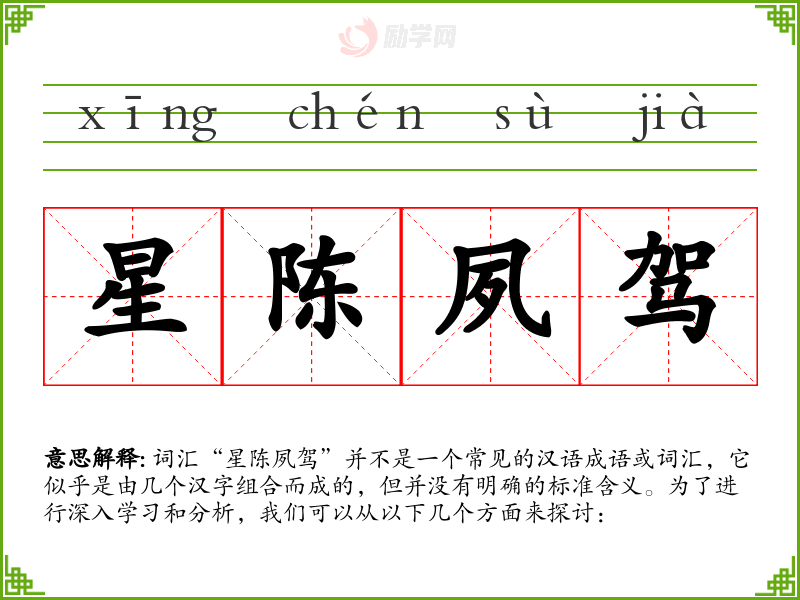由于“星陈夙驾”不是一个标准的词汇或成语,我们无法给出一个确切的字面意思和基本含义。它可能是某个特定文学作品中的创造性表达,或者是某个特定语境下的临时组合。