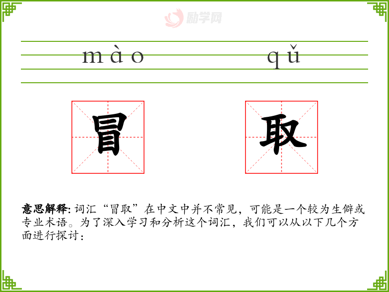 词汇“冒取”在中文中并不常见,可能是一个较为生僻或专业术语。为了深入学习和分析这个词汇,我们可以从以下几个方面进行探讨:
