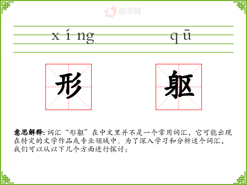 “形躯”是一个具有特定文化背景和专业领域应用的词汇。在语言学和表达中,了解和掌握这样的词汇可以增加语言的丰富性和表达的精确性。通过对“形躯”的深入学,我们可以更好地理解其在不同语境中的应用和意义。