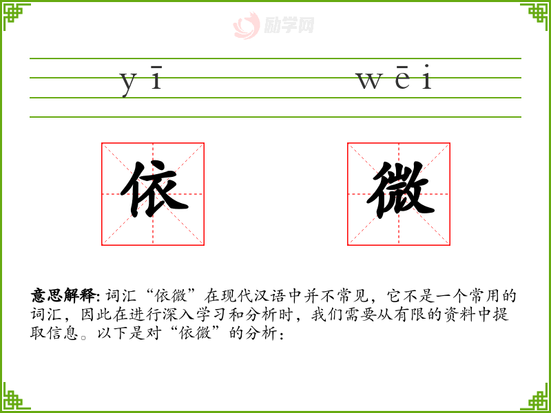 词汇“依微”在现代汉语中并不常见,它不是一个常用的词汇,因此在进行深入学习和分析时,我们需要从有限的资料中提取信息。以下是对“依微”的分析: