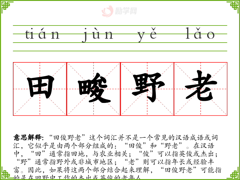 “田俊野老”这个词汇并不是一个常见的汉语成语或词汇,它似乎是由两个部分组成的:“田俊”和“野老”。在汉语中,“田”通常指田地,与农业相关;“俊”可以指英俊或杰出;“野”通常指野外或非城市地区;“老”则可以指年长或经验丰富。因此,如果将这两个部分结合起来理解,“田俊野老”可能指的是在田野中工作的杰出或英俊的老年人。