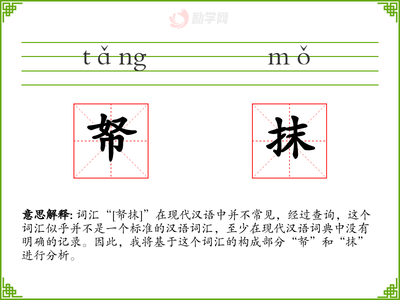 词汇“[帑抹]”在现代汉语中并不常见,经过查询,这个词汇似乎并不是一个标准的汉语词汇,至少在现代汉语词典中没有明确的记录。因此,我将基于这个词汇的构成部分“帑”和“抹”进行分析。