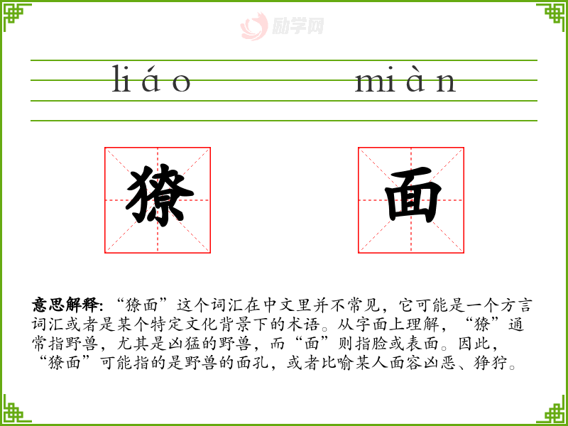 “獠面”这个词汇在中文里并不常见,它可能是一个方言词汇或者是某个特定文化背景下的术语。从字面上理解,“獠”通常指野兽,尤其是凶猛的野兽,而“面”则指脸或表面。因此,“獠面”可能指的是野兽的面孔,或者比喻某人面容凶恶、狰狞。
