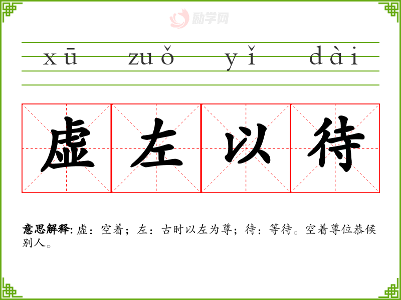 虚:空着;左:古时以左为尊;待:等待。空着尊位恭候别人。