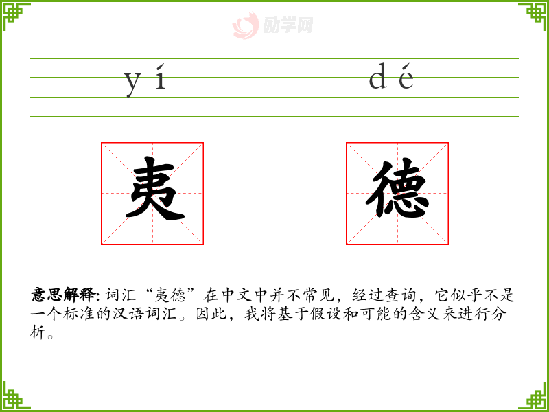 词汇“夷德”在中文中并不常见,经过查询,它似乎不是一个标准的汉语词汇。因此,我将基于假设和可能的含义来进行分析。