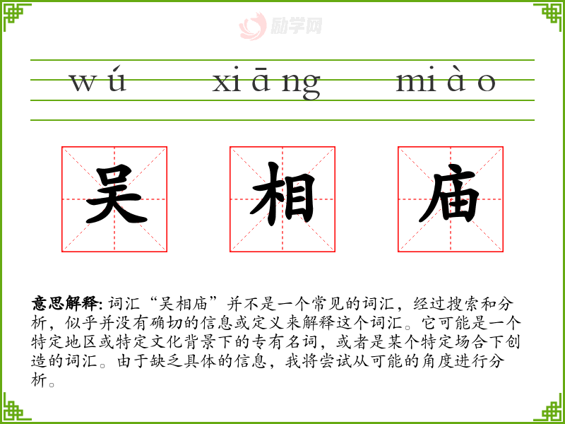 词汇“吴相庙”并不是一个常见的词汇,经过搜索和分析,似乎并没有确切的信息或定义来解释这个词汇。它可能是一个特定地区或特定文化背景下的专有名词,或者是某个特定场合下创造的词汇。由于缺乏具体的信息,我将尝试从可能的角度进行分析。