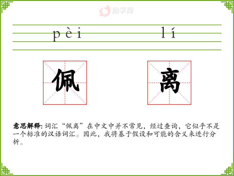 词汇“佩离”在中文中并不常见,经过查询,它似乎不是一个标准的汉语词汇。因此,我将基于假设和可能的含义来进行分析。