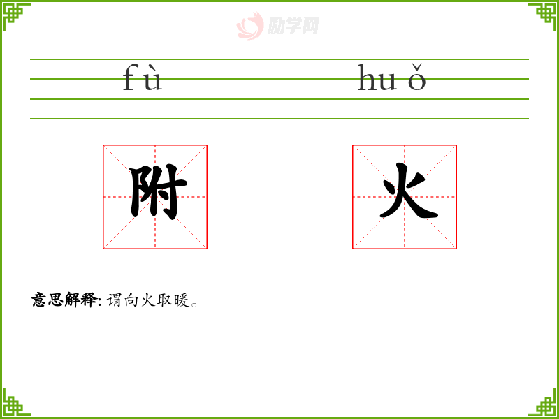 《说文》-火,南方之行也。炎而上,象形。 《春秋·元命苞》-火之为言委随也,故字人散二者为火也。 《易·说卦》-离为火。 《左传·昭公九年》-火水妃也。春秋感情符,火者阳之精也。 《论衡·诘术》-火,日气也。 《左传·宣公十六年》-人火曰火,天火曰灾。 《谷梁传·昭公九年》-国曰灾,邑曰火。 《公羊传·襄公九年》-大者曰灾,小者曰火。 宋·沈括《梦溪笔谈·活板》-火烧令坚。
