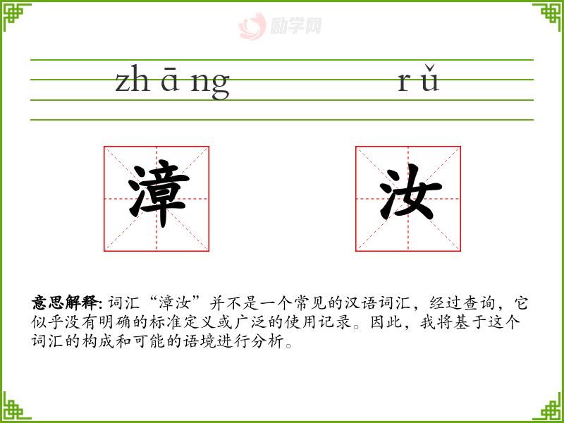 词汇“漳汝”并不是一个常见的汉语词汇,经过查询,它似乎没有明确的标准定义或广泛的使用记录。因此,我将基于这个词汇的构成和可能的语境进行分析。
