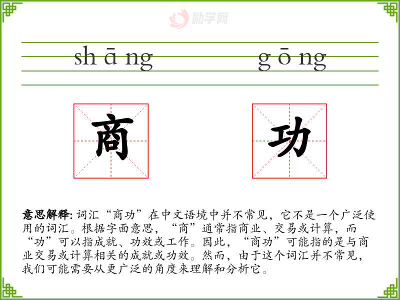 总的来说,“商功”是一个不常见的词汇,其含义和使用范围有限。在语言学习和表达中,它可能不是一个重要的词汇。然而,对于特定的商业领域或文化背景,了解和掌握这个词汇可能有助于更准确地表达商业成就和效益。
