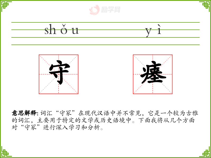 词汇“守冢”在现代汉语中并不常见,它是一个较为古雅的词汇,主要用于特定的文学或历史语境中。下面我将从几个方面对“守冢”进行深入学*和分析。