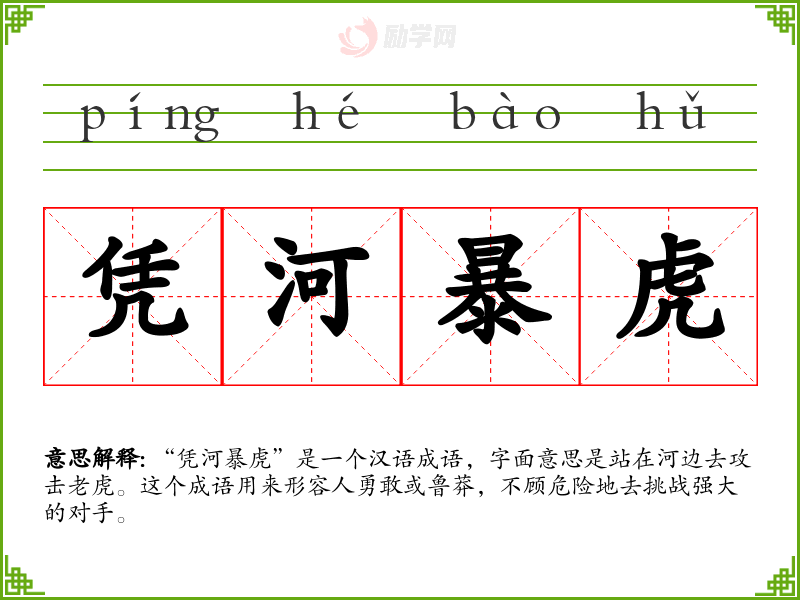 “凭河暴虎”是一个汉语成语,字面意思是站在河边去攻击**。这个成语用来形容人勇敢或鲁莽,不顾危险地去挑战强大的对手。