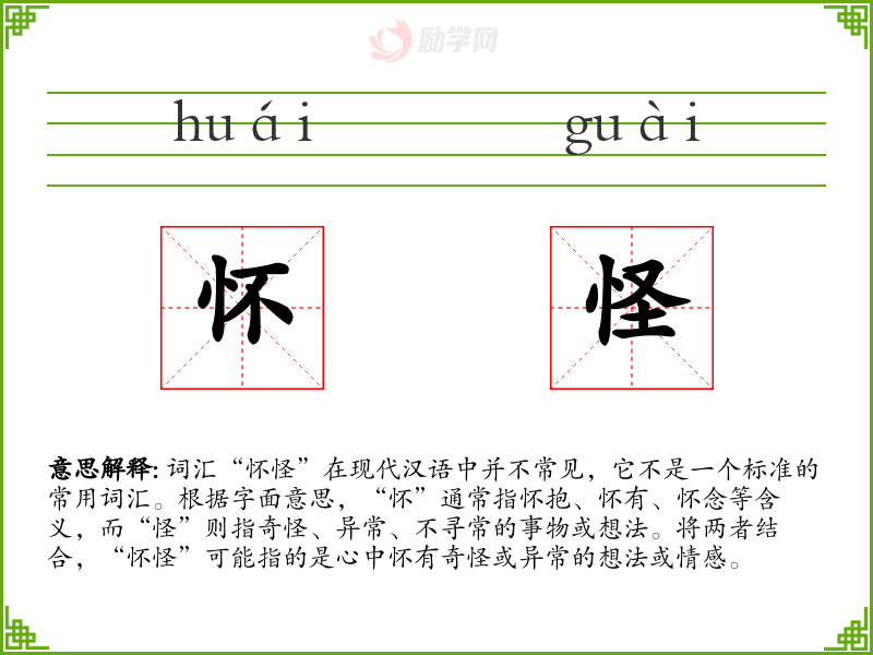 词汇“怀怪”在现代汉语中并不常见,它不是一个标准的常用词汇。根据字面意思,“怀”通常指怀抱、怀有、怀念等含义,而“怪”则指奇怪、异常、不寻常的事物或想法。将两者结合,“怀怪”可能指的是心中怀有奇怪或异常的想法或情感。