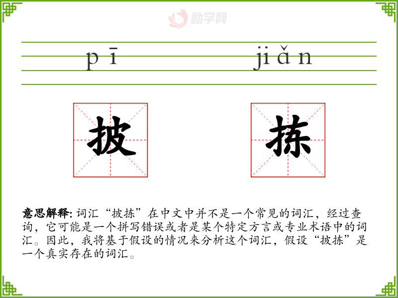 由于“披拣”不是一个标准词汇,它在语言学习和表达中的重要性非常有限。如果它是一个真实存在的词汇,了解它的含义和用法可能需要特定的上下文和背景知识。