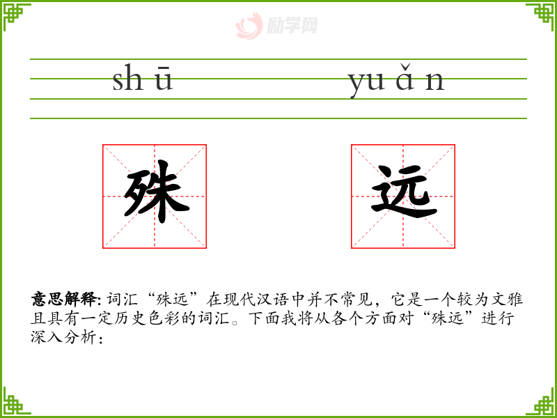 “殊远”一词虽然在现代汉语中不常用,但它富含诗意和哲理,能够丰富语言的表达层次。在学*语言和表达时,了解和掌握这样的词汇,可以提升语言的深度和广度。