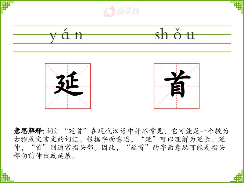 词汇“延首”在现代汉语中并不常见,它可能是一个较为古雅或文言文的词汇。根据字面意思,“延”可以理解为延长、延伸,“首”则通常指头部。因此,“延首”的字面意思可能是指头部向前伸出或延展。