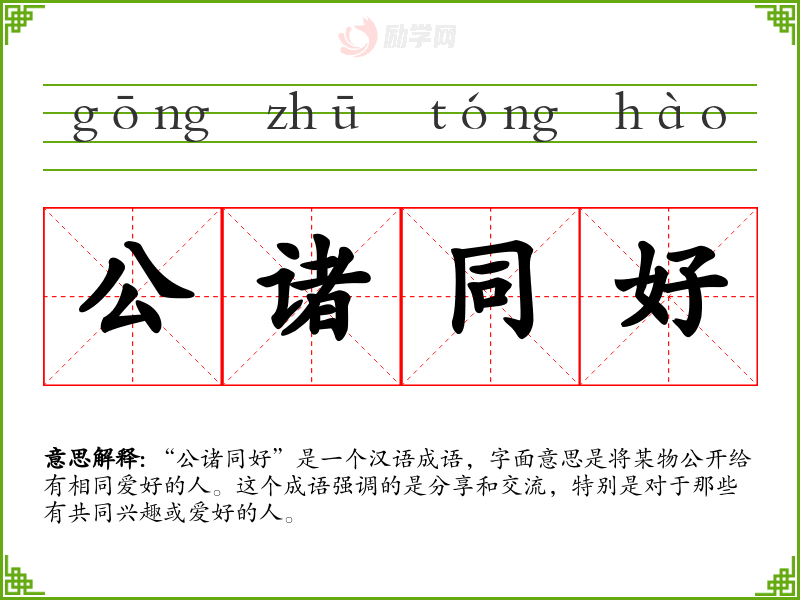“公诸同好”是一个汉语成语,字面意思是将某物公开给有相同爱好的人。这个成语强调的是分享和交流,特别是对于那些有共同兴趣或爱好的人。