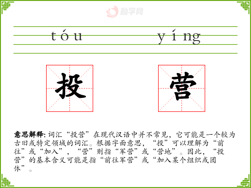 - 理解:“投营”是一个具有特定历史和文化背景的词汇,它不仅描述了加入军事组织的行为,也反映了个人在特定社会环境中的选择和命运。
