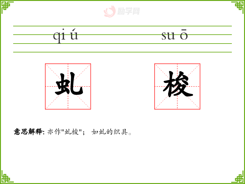 虬梭的意思是:亦作"虬梭"; 如虬的织具。
