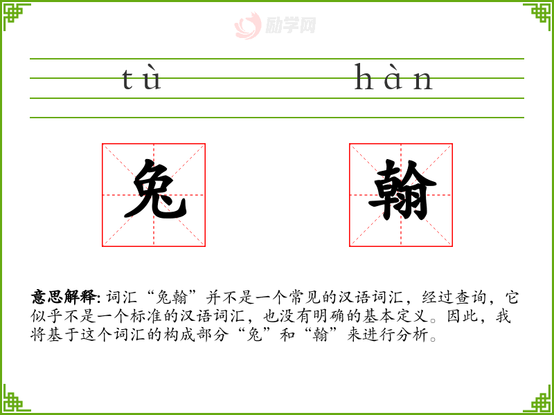 - 反义词:由于“兔翰”不是一个标准词汇,很难找到明确的反义词。