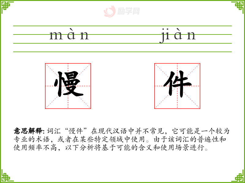 词汇“慢件”在现代汉语中并不常见,它可能是一个较为专业的术语,或者在某些特定领域中使用。由于该词汇的普遍性和使用频率不高,以下分析将基于可能的含义和使用场景进行。