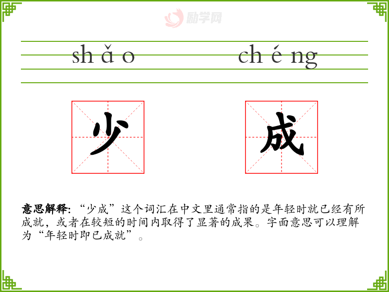 “少成”这个词汇在中文里通常指的是年轻时就已经有所成就,或者在较短的时间内取得了显著的成果。字面意思可以理解为“年轻时即已成就”。