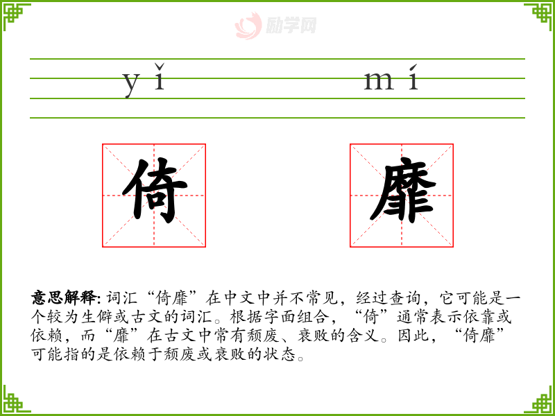 - 理解:倚靡这个词虽然不常见,但它提供了一个描述特定消极状态的词汇,有助于丰富语言表达的层次。