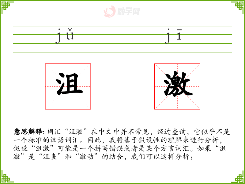 - 字面意思和基本含义:假设“沮激”是“沮丧”和“激动”的结合,那么它可能指的是一种情绪状态,介于沮丧和激动之间,即在失望中带有某种程度的兴奋或紧张。