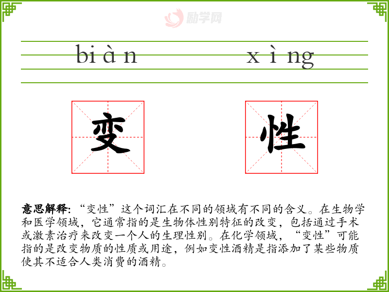 在文学中,“变性”可能被用来象征性地描述人物的内心变化或成长。在口语中,这个词可能被用来描述某人性格或行为的突然改变。在专业领域,如性别研究或医学,这个词的使用则更加精确和技术性。