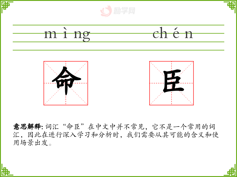 词汇“命臣”在中文中并不常见,它不是一个常用的词汇,因此在进行深入学*和分析时,我们需要从其可能的含义和使用场景出发。