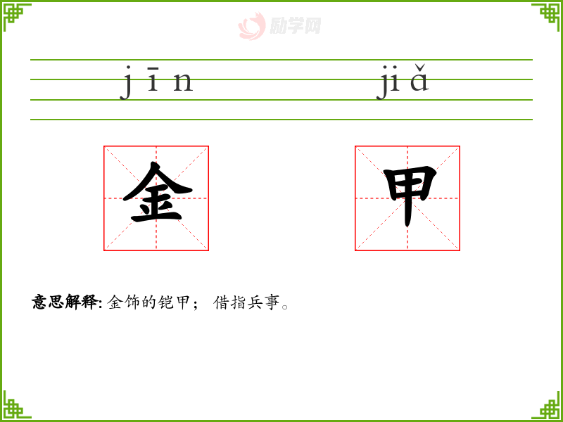金甲的意思是:金饰的铠甲; 借指兵事。