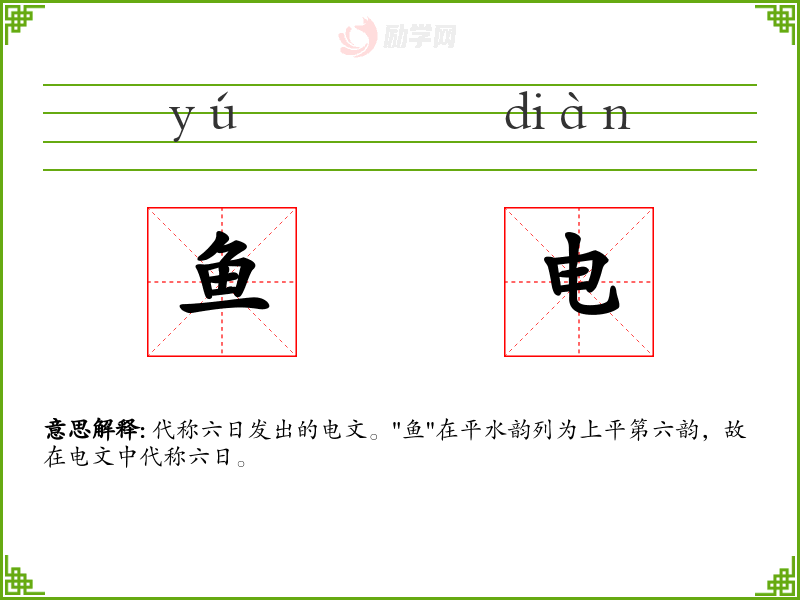 鱼电的意思是:代称六日发出的电文。"鱼"在平水韵列为上平第六韵,故在电文中代称六日。