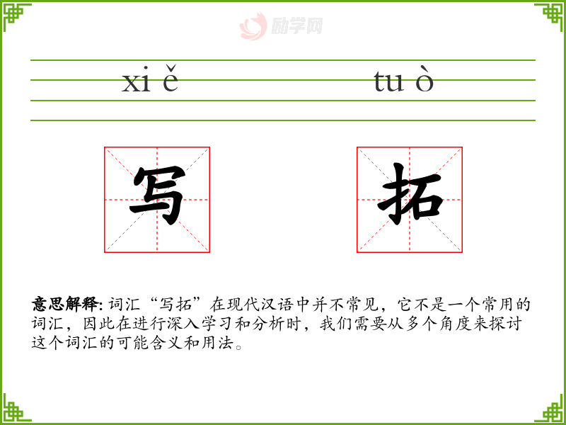 词汇“写拓”在现代汉语中并不常见,它不是一个常用的词汇,因此在进行深入学*和分析时,我们需要从多个角度来探讨这个词汇的可能含义和用法。