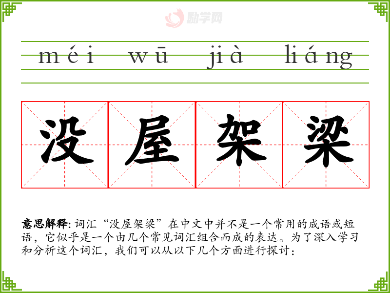 词汇“没屋架梁”在中文中并不是一个常用的成语或短语,它似乎是一个由几个常见词汇组合而成的表达。为了深入学*和分析这个词汇,我们可以从以下几个方面进行探讨: