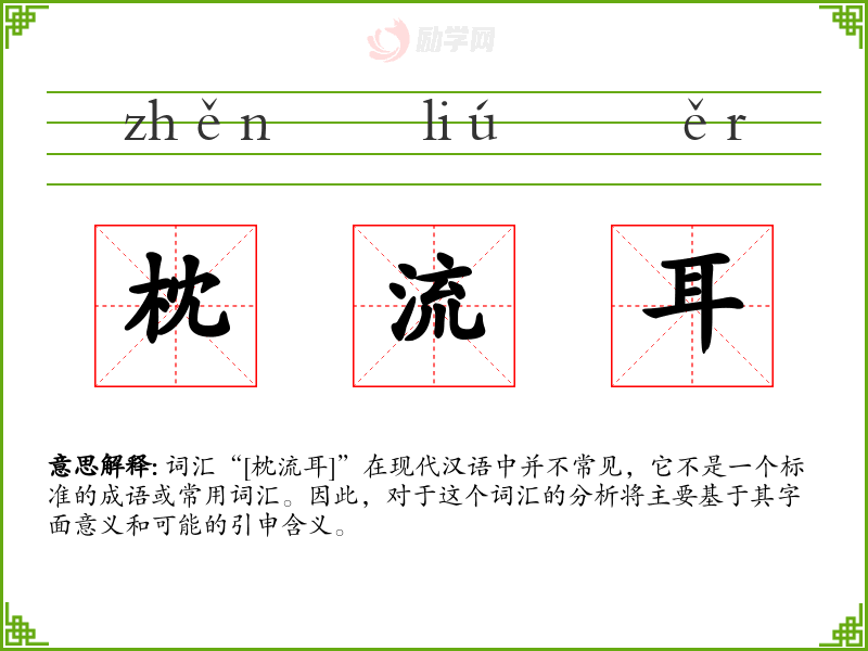 词汇“[枕流耳]”在现代汉语中并不常见,它不是一个标准的成语或常用词汇。因此,对于这个词汇的分析将主要基于其字面意义和可能的引申含义。