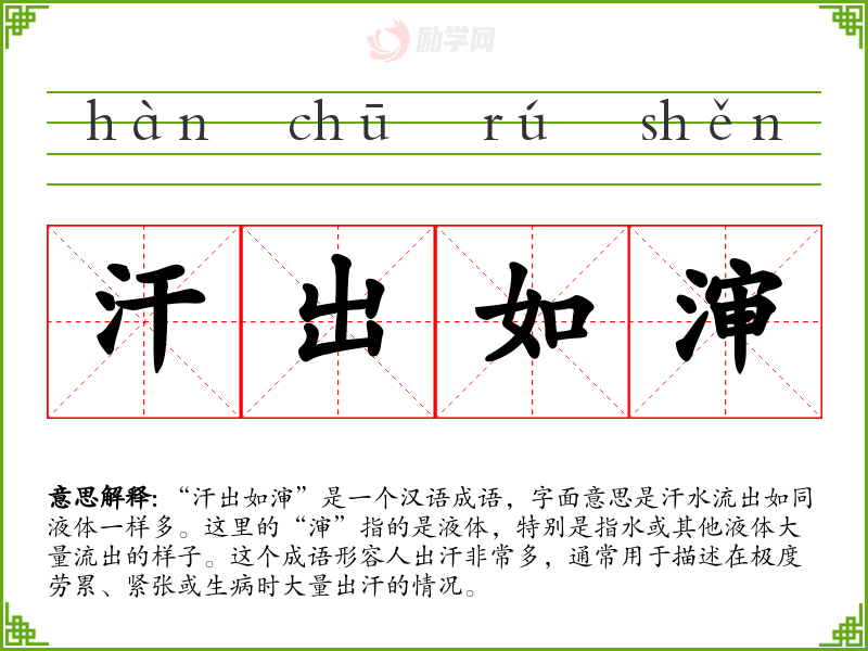 在文化中,出汗常常被视为身体排毒和调节体温的一种方式。因此,“汗出如渖”在描述身体反应时,也隐含了对身体状态的一种关注。在社会背景中,这个成语可能更多地被用于描述劳动者的辛勤工作或员的拼搏精神。