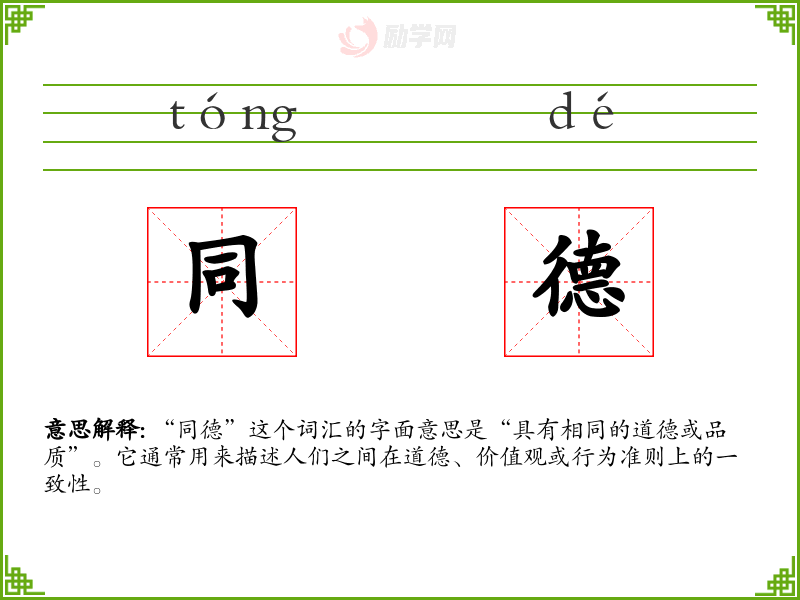 “同德”这个词汇的字面意思是“具有相同的道德或品质”。它通常用来描述人们之间在道德、价值观或行为准则上的一致性。