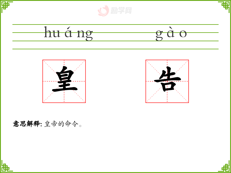 《说文》-告,牛触人。角着横木,所以告人也。 《书·金滕》-乃告太王王季文王。 《易·益》-告公用圭。 《诗·齐风·南山》-必告父母。 《仪礼·乡射礼》-以告于乡先生君子。 《尔雅·释言》-告,请也。 《吕氏春秋·赞能》-敢以告于先君。 《书·康王之诰》-敢敬告天子。 《书·甘誓》-予誓告汝。 《书·汤诰》-诞告万方。 《列子·杨朱》-不告而娶。 诸葛亮《出师表》-不效则治臣之罪,以告先帝之灵。 宋·欧阳修《新五代史·伶官传·序》-入于太庙,还矢先王,而告以成功。 《资治通鉴·唐纪》-或告元济曰:“官军至矣!”