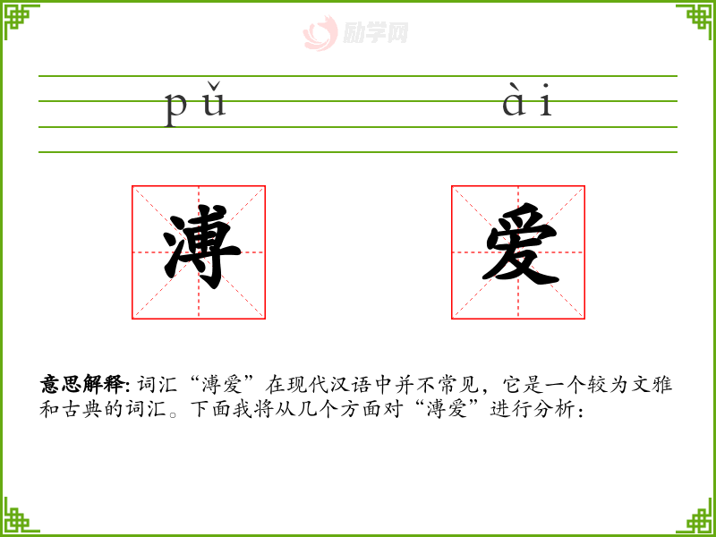 词汇“溥爱”在现代汉语中并不常见,它是一个较为文雅和古典的词汇。下面我将从几个方面对“溥爱”进行分析: