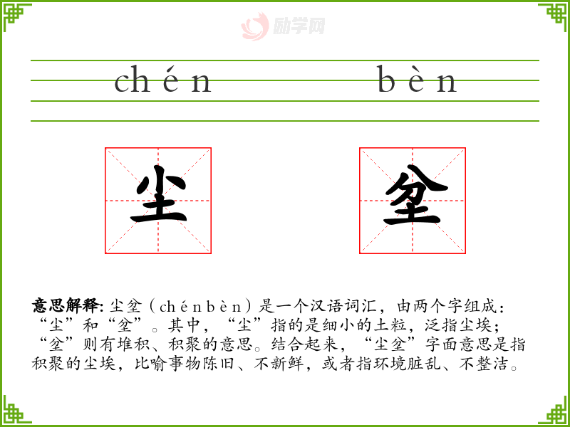 “尘”字古已有之,源自甲骨文,意为细小的土粒。“坌”字则较晚出现,原意为堆积、积聚。两个字结合成“尘坌”,强调了尘埃的积聚状态,随着时间的推移,其含义逐渐固定为形容陈旧或脏乱的环境。