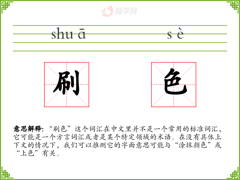 “刷色”这个词汇在中文里并不是一个常用的标准词汇,它可能是一个方言词汇或者是某个特定领域的术语。在没有具体上下文的情况下,我们可以推测它的字面意思可能与“涂抹颜色”或“上色”有关。